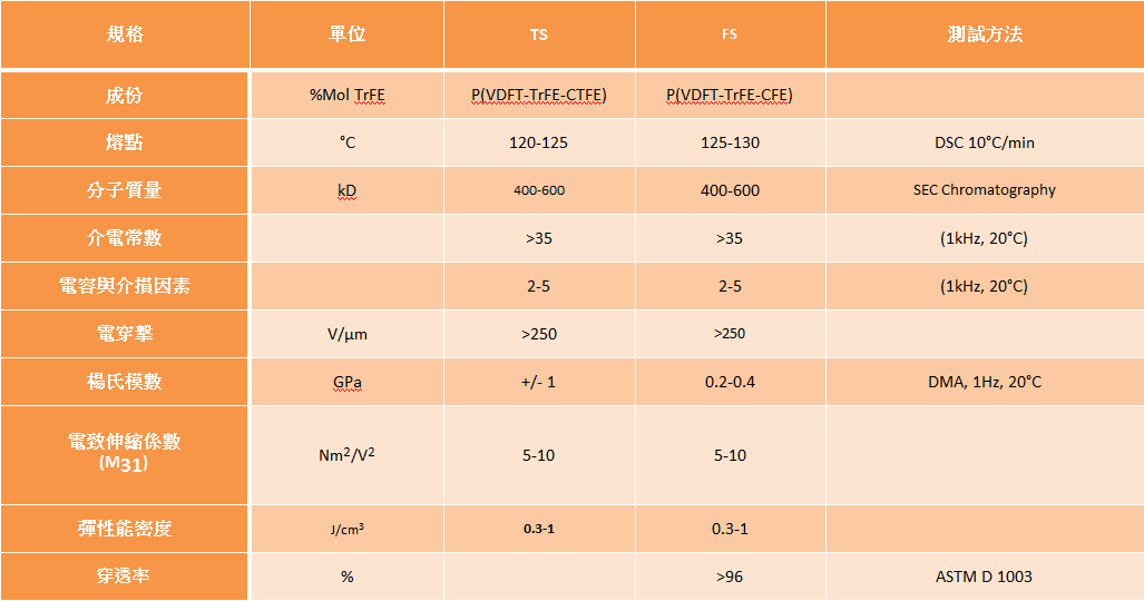 為可弛張鐵電三元共聚物及油墨,此產(chǎn)品帶有高介電常數(shù)及機(jī)電特性,可運(yùn)用於high-k dielectrics, 致動(dòng)器及電熱裝置等等…。