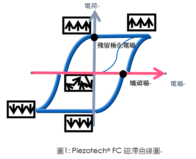 Piezotech® FC 為鐵電聚合物,該薄膜的極化與電場關(guān)系如圖1所示。從關(guān)系圖可觀察到?jīng)]有施加電場時的殘留極化電場(Pr),并且其極化方向?qū)⒃赱E]>Ec(矯頑場)時產(chǎn)生反向轉(zhuǎn)置。