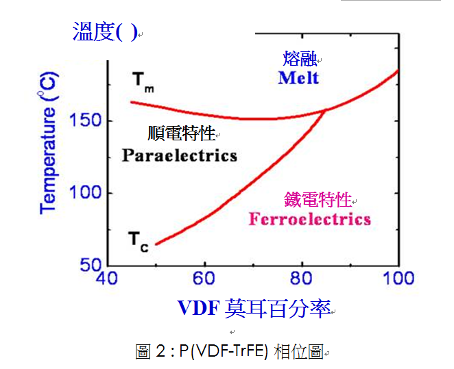 共聚物于鐵電與順電的特性將隨居禮溫度(Tc)變化,而鐵電與順電特性之間的變化溫度將取決于共聚物的組成,如圖2所示。 在極化后,聚合物將表現(xiàn)出壓電及熱電特性。