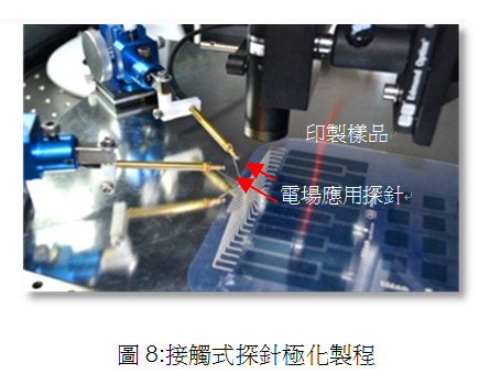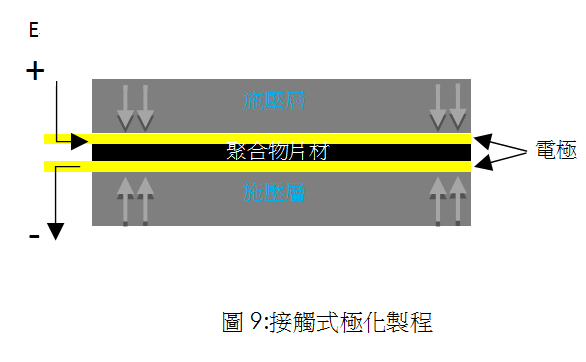 對于印刷組件(主要為薄層),可透過探針接觸系統(tǒng)直接通過薄膜電極施加極化電場,如圖8所示;而對于非印刷組件(厚層),可透過兩個電極之間的接觸和施壓來完成極化,如圖9所示;而針對大表面對象,則可以使用電暈極化。