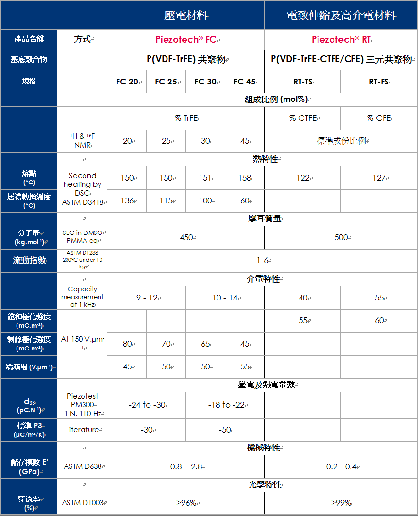 Piezotech® FC 為一種可印刷式電活性聚合物P(VDF-TrFE),可經(jīng)由沉積、退火、極化等處理,展現(xiàn)其熱電及壓電特性。典型的應(yīng)用為: