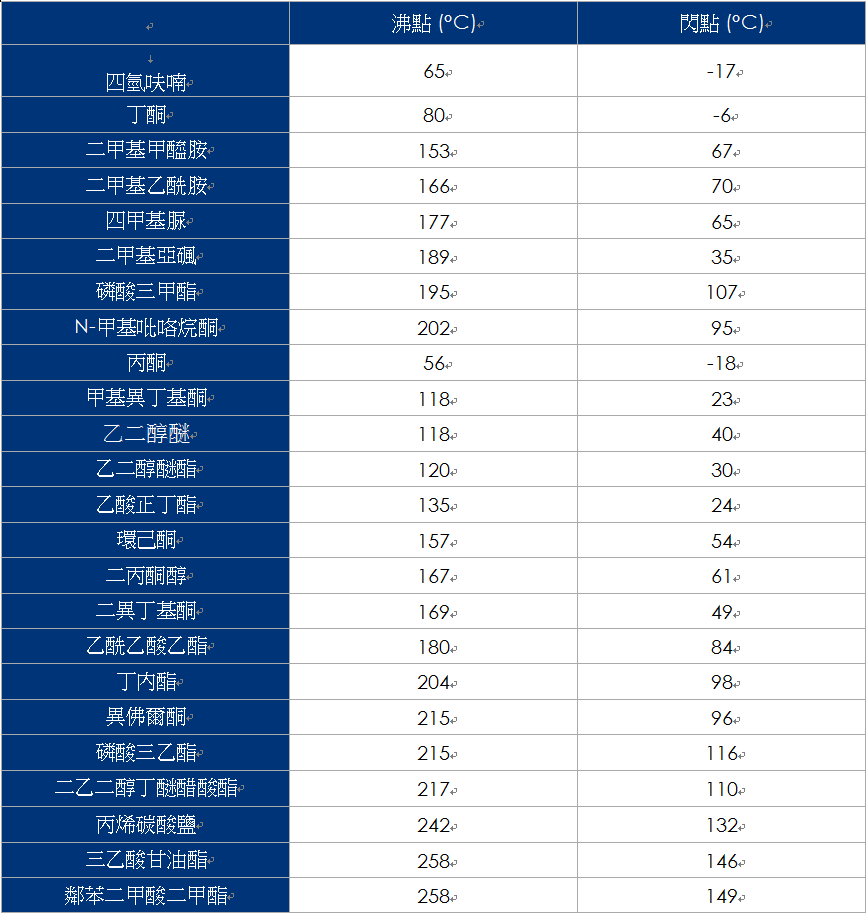 下表為建議使用于溶解與配制Piezotech FC ® 和Piezotech ® RT之溶劑: