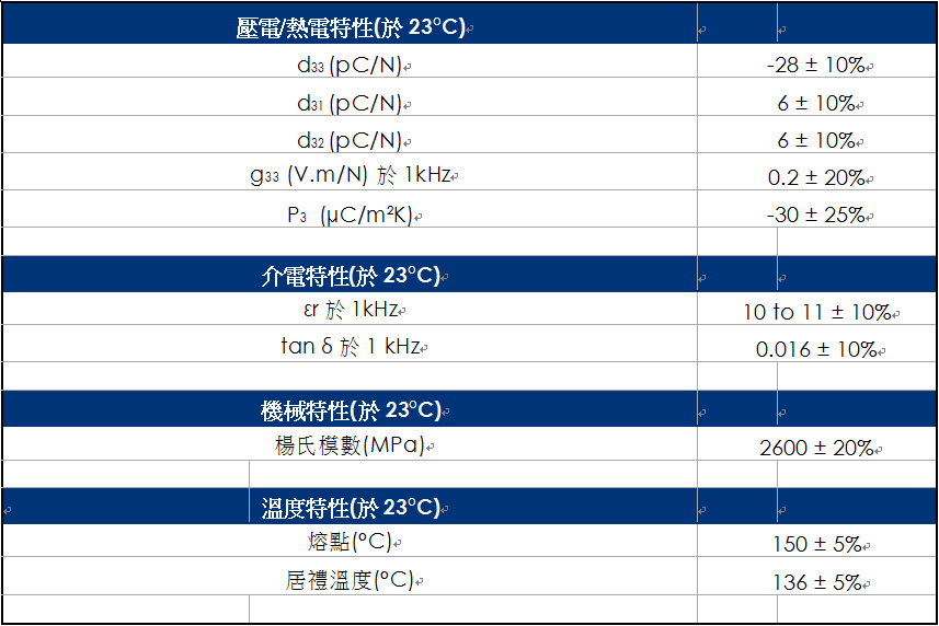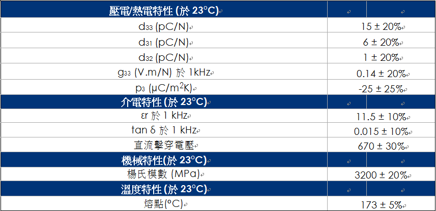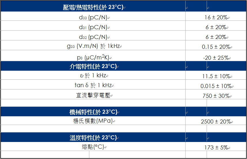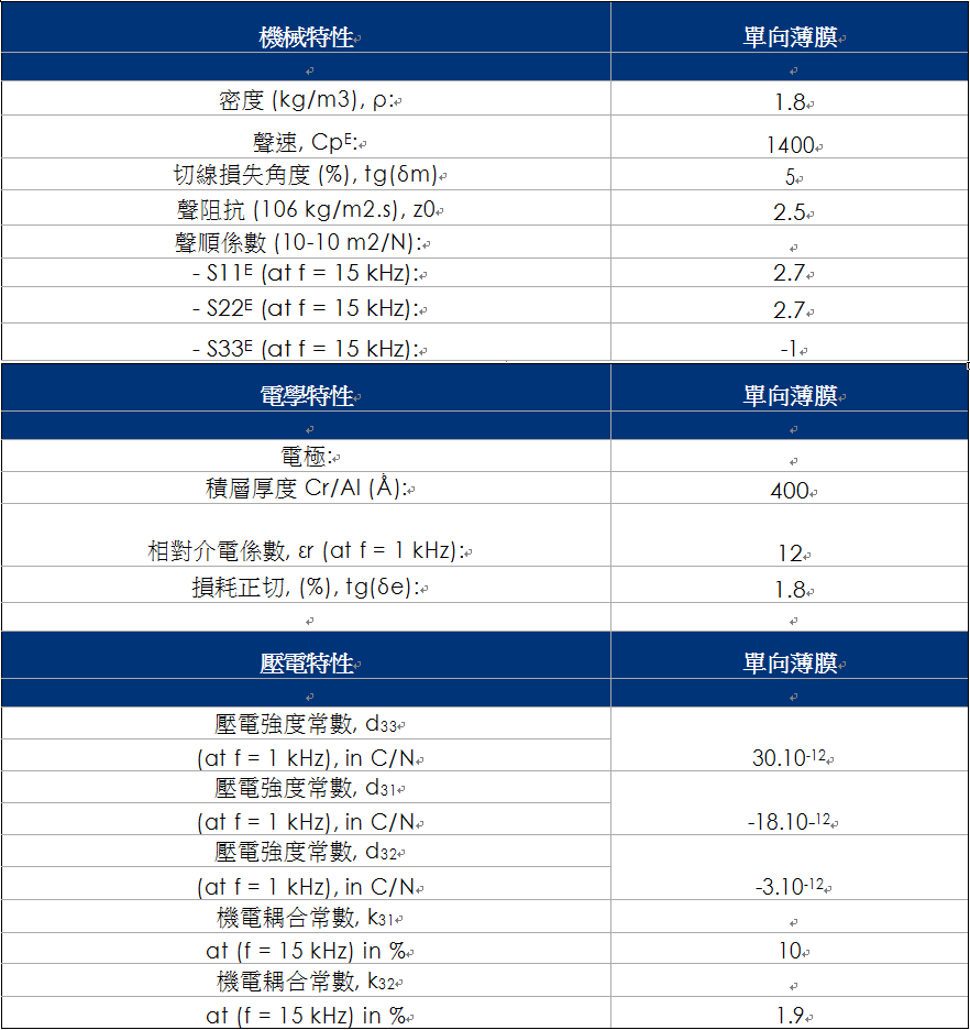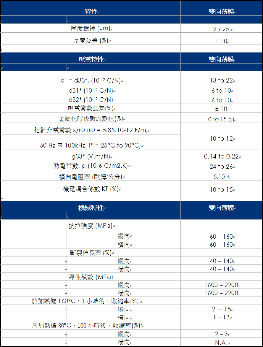 本公司生產(chǎn)之壓電薄膜與薄板的單向、雙向特性將由下表顯示,可根據(jù)不同的應用范疇,將這些薄膜與薄板涂上不同的金屬層。