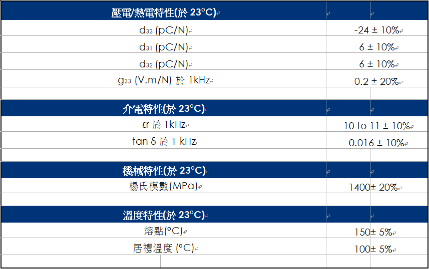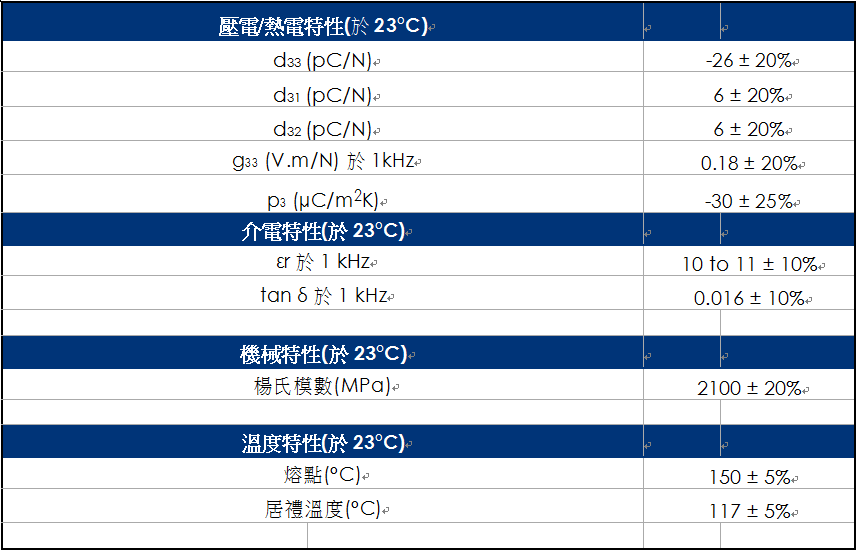 熱電常數(shù)“ρ”則被定義為當薄膜升高1度K時的表面電荷密度,單位為(C/m²K),常用以設計熱傳感器。而壓電薄膜的特性主要取決于其機械特性,包含彈性模數(shù)、阻抗值以及斷裂伸長率。
